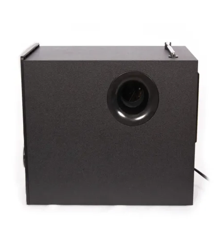 The system includes a wireless remote control for easy adjustments and a built-in FM radio tuner with a telescopic antenna for added convenience. Built with a durable MDF subwoofer cabinet and finished in sleek black, the subwoofer measures 165 × 290 × 240 mm, while each satellite measures 90 × 75 × 180 mm, with a total weight of 4.40 kg.