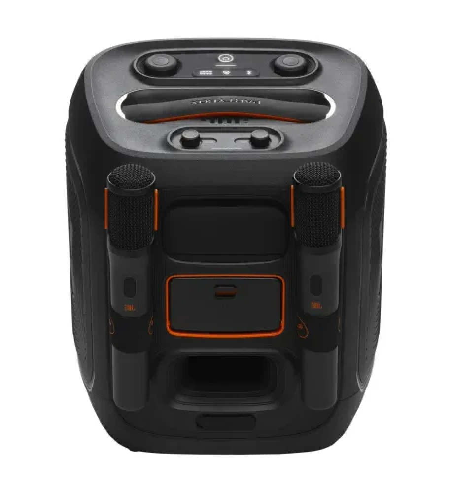 Equipped with dual wireless microphones, the JBL PartyBox Encore 2 Portable Speaker makes karaoke effortless, allowing two people to sing together without tangled wires. The mics feature low latency and clear voice pickup, perfect for duets, speeches, or hosting events.