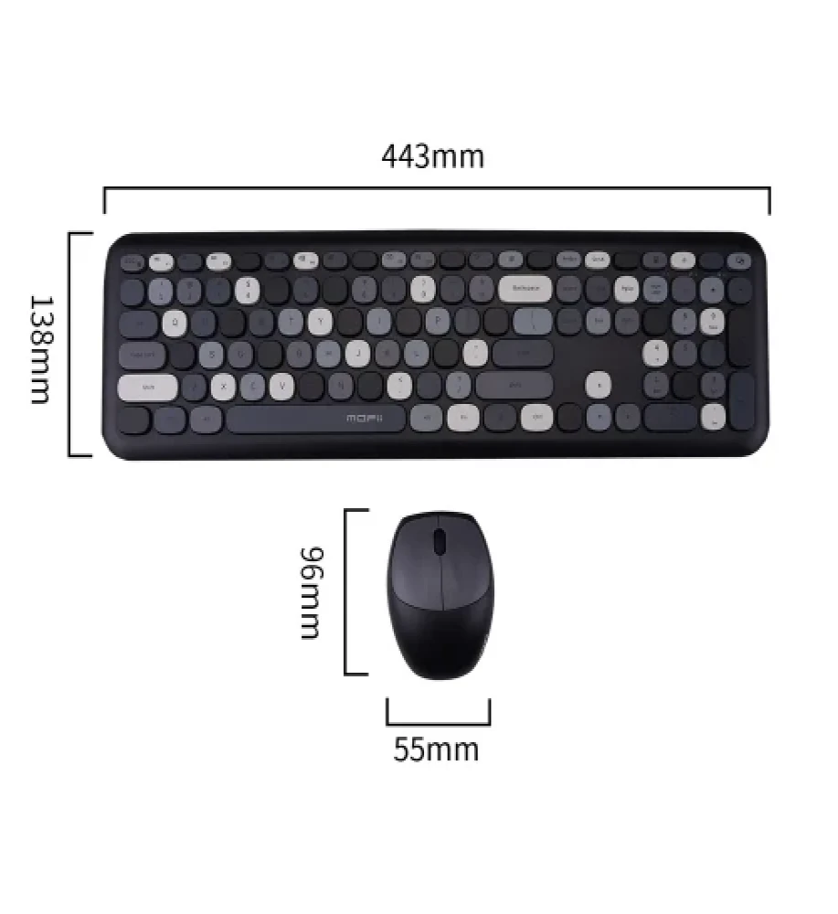 With mixed colorful injection keycaps and a full injection color design, the Mofii 666 combo adds a playful yet professional aesthetic to any desk setup. The keyboard measures 443 × 137.7 × 28.8 mm, while the compact mouse measures 69.2 × 104.7 × 36 mm, making them ideal for home, office, or study environments.